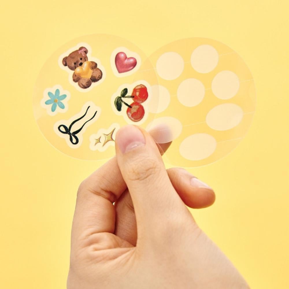 تتضمن المجموعة لصقات بحجم 16×11 مم للمناطق الواسعة مثل الخدين أو الجبهة، و12×12 مم للبثور الصغيرة. استمتعي بلصقات شفافة أو مزينة برسومات مثل دب، نجمة، قلب، كرز، زهرة، وشريط.