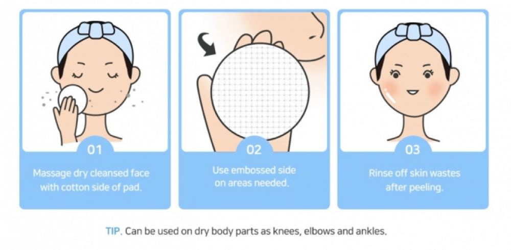 امسح الأوساخ والجلد الميت برفق باستخدام وسادة التقشير المضمنة في هذه العبوة. أخرجي ضمادات الترطيب وضعيها على المنطقة التي تحتاج إلى ترطيب.
