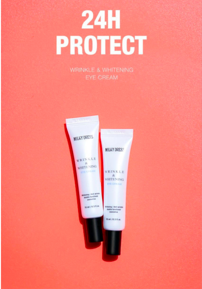 MILKY DRESS Wrinkle & Whitening Eye Cream هو كريم للعين من نوع هلام منعش يحسن الهالات تحت العين والتجاعيد ، وفي نفس الوقت يحافظ على ترطيب العيون وحيويتها. بالإضافة إلى ذلك ، فإنه يعتني أيضًا بشكل مكثف بتغذية وترطيب العيون الضعيفة والجافة بسهولة لمدة 24 ساعة للعيون الأكثر إشراقًا .كيف تستعمل:ضع كمية معتدلة من كريم العين تحت منطقة العين وخطوط الضحك.افرد الكريم بإصبعك.ربت بلطف لامتصاص.فوائد:توازن الماء والزيت للحفاظ على توازن الجلدكريم منعش وناعم من النوع الجل يعالج البشرة الضعيفة حول منطقة العينيشد ويضيء دوائر العين الداكنة ومنطقة العين وخطوط الضحك