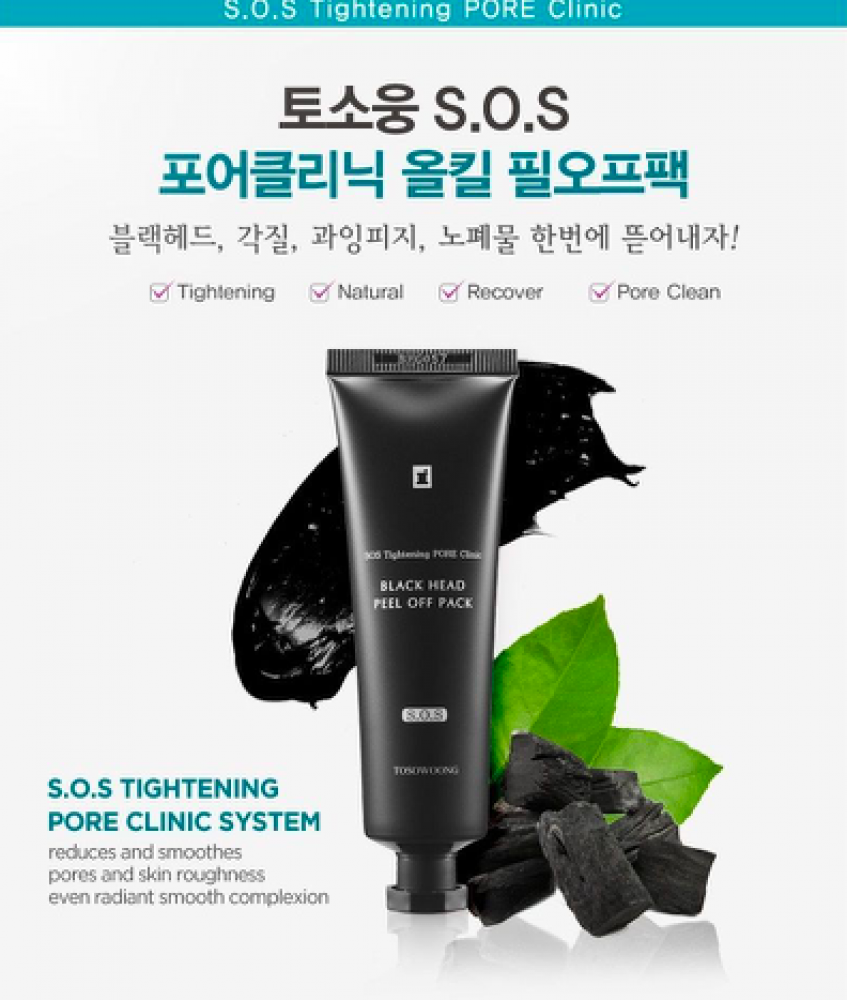 TOSOWOONG SOS Tightening Pore Clinic Black Head Peel Off Pack هو قناع يزيل شوائب البشرة ، الزيوت وخلايا الجلد الميتة للحصول على بشرة نظيفة وناعمة.تيقشر القناع ويمتص وينظم إفراز الزيوت ، ويزيل الرؤوس السوداء وينقي البشرة.مكون من بودرة الفحم ، مستخلصات من أوراق اليوسفي وأوراق الصبار ، كما أنه يوفر تأثير التبريد وبالتالي يترك البشرة مرنة.كيف تستعمل:1. بعد التنظيف ،هيئي البشرة باستخدام التونر.2. وزعي القناع على الوجه وتجنب منطقة العين والشفاه.3. عندما يجف بعد 20-30 دقيقة ، تقشر من الجزء السفلي.4. إمسحي بالتونر.