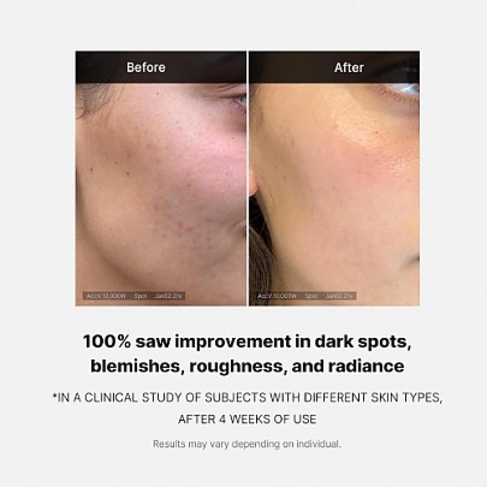 على مدار فترة 4 أسابيع، شهد *100% من المشاركين تحسنًا ملحوظًا في التصبغ والبقع الداكنة والتقشير والترطيب وإشراق البشرة..