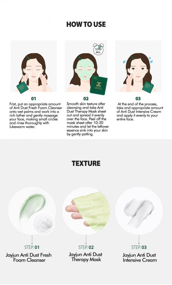 الخطوة 1 قناع جايجون المضاد للغبار:المكونات النشطة المهدئة للبشرة المضمنة في عبوة قناع تفتيح البشرة هذه ، تتسرب عميقًا في الجلد وتجعل الجلد المتعب من الغبار الناعم يبدو حيويًا ونظيفًا ويضيء عنصر تفتيح البشرة Niacinamide البشرة.الخطوة 2 Jayjun Anti Amustust Luster Ampule:إنها عبارة عن حزمة نوم عالية الإغناء تساعد على تفتيح البشرة عن طريق تفتيح لون الميلانين في الجلد وتجعل البشرة ناعمة ولامعة.الخطوة 3 عيون Jayjun المضادة للغبار تحت مصحح:إنها مستحضرات تجميل مزدوجة الوظائف تعمل على تفتيح البشرة وإزالة التجاعيد تعمل على تفتيح البشرة الداكنة حول العينين ومن خلال توصيل العناصر الغذائية إلى عمق الجلد ، مما يجعل منطقة العين مشدودة.كيف تستعمل:على بشرة ناعمة بعد التنظيف وأخرج ورقة القناع المضاد للغبار ونشره بالتساوي على الوجه.انزع ورقة القناع بعد 10-20 دقيقة واترك الجوهر المتبقي يغرق في بشرتك عن طريق التربيت بلطف.بعد وضع ورقة القناع ، خذ كمية مناسبة من Ampule Lust Luster Ampule وقم بتطبيقه بالتساوي على بشرتك.في نهاية العملية ، خذ وكمية مناسبة من العيون المضادة للغبار تحت مصحح وضعها على منطقة العين بالتساوي.